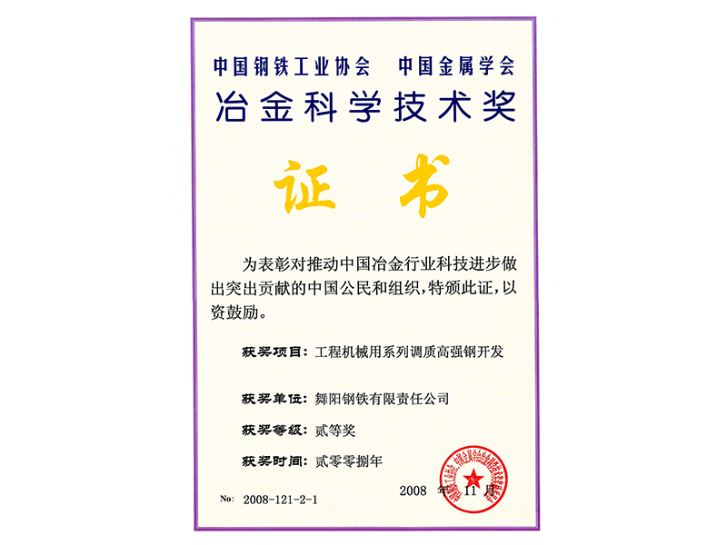 2008年11月獲冶金科學技術獎